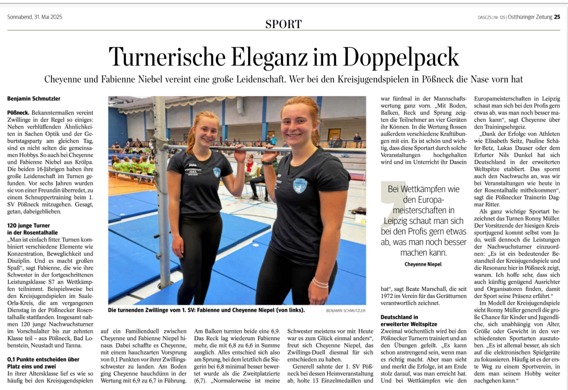Die 31. Kreisjugendspiele 2025 im Gerätturnen fanden am 27.05.2025 mit 120 Teilnehmern, darunter 16 Jungen, aus Bad Lobenstein, Pößneck, Neustadt und Tanna in der Pößnecker Rosentalhalle statt.