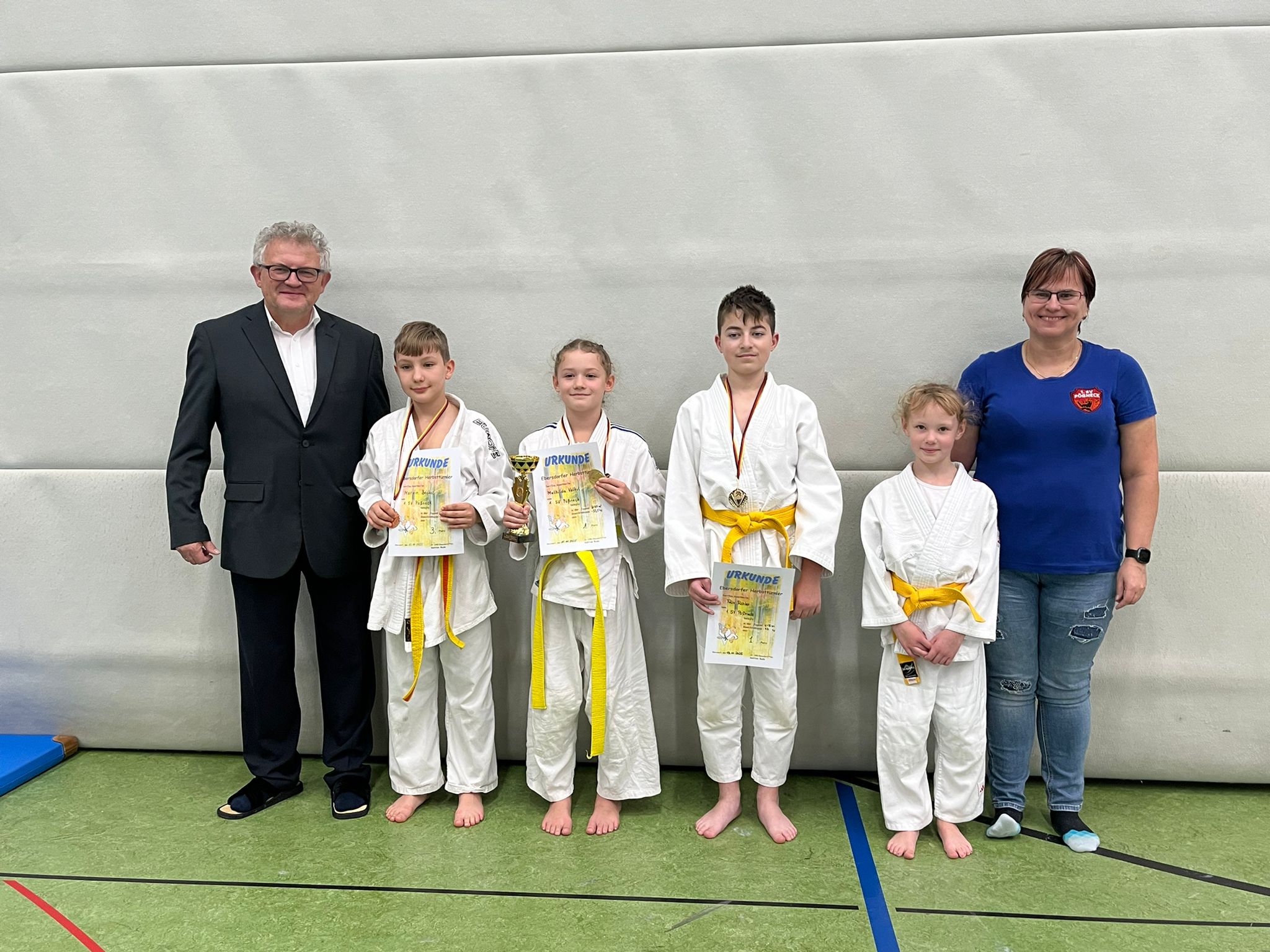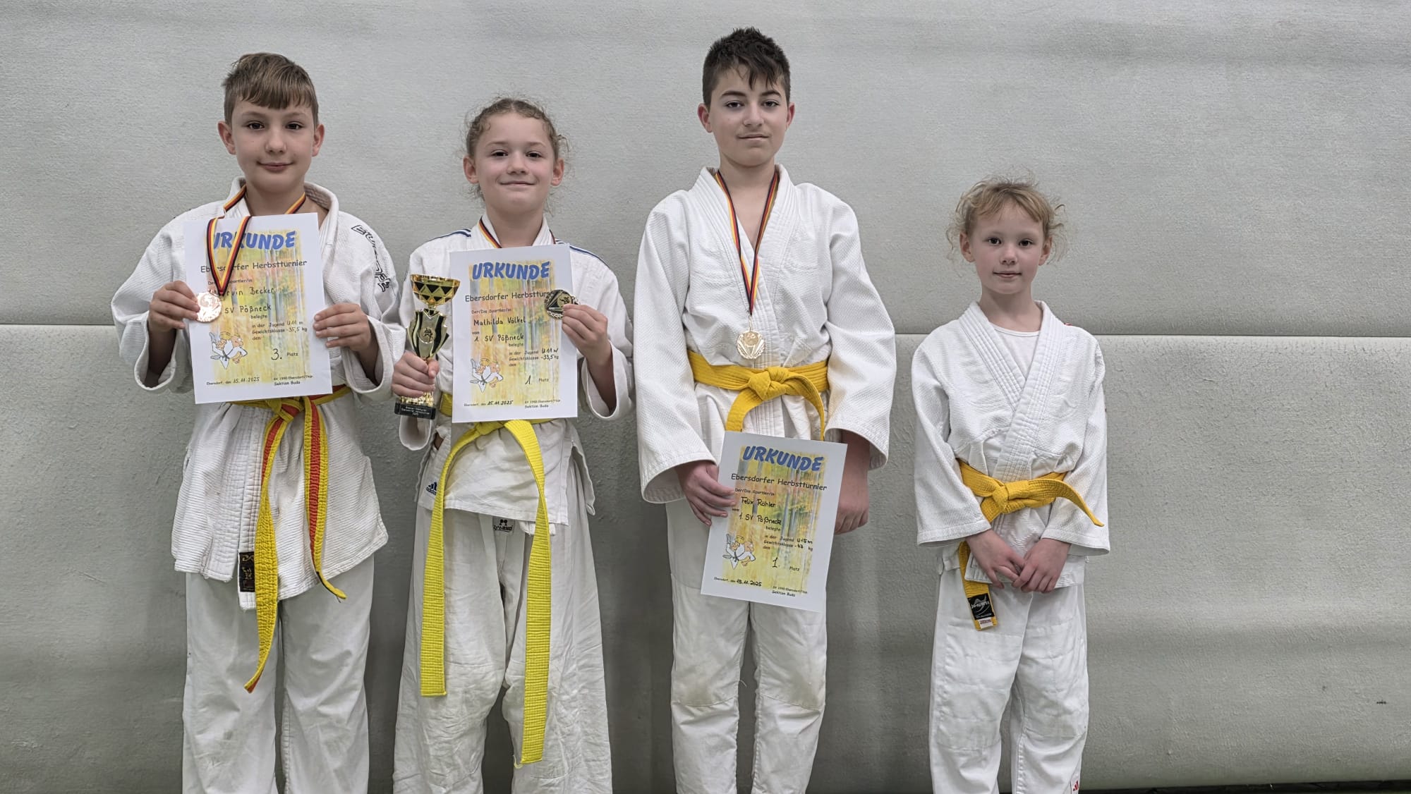 Am 15.11.2025 nahmen  4 unserer Judokas an einem Wettkampf in Ebersdorf (Lobenstein) teil. Für einige war es die erste Teilnahme an einem Wettkampf außerhalb unseres Trainings. Natürlich ist es nicht immer leicht und vieles ist neu und verunsichert auch den Ein oder Anderen. Für die Gemeinschaft war es deshalb auch schön, dass einige schon an mehreren Wettkämpfen teilgenommen hatten und etwas unterstützend mitwirken konnten. Hierbei sind wir als Trainer auch dankbar über die Mithilfe der Eltern. Wir konnten uns über 2 erste Plätze, 1 dritten Platz und 1 fünften Platz freuen. Die größte Überraschung gab es jedoch zum Schluß. Aus unseren Reihen wurde Mathilda Völkel mit einem Preis als beste Technikerin in ihrer Altersklasse U11 ausgezeichnet. Sie hat sehr stark gekämpft und ihr Wissen aus dem Training sehr gut umgesetzt und somit hatte sie diesen Preis auch verdient. Den Pokal nahm sie gerne entgegen. Auch unser ältester Judoka hatte bei diesem Wettkampf als Kampfrichter seinen Einsatz. In  diesem Sinne auf erfolgreiche weitere Wettkämpfe.