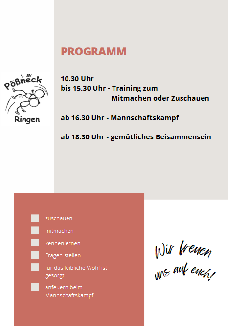 Am Samstag, den 1.Juni 2024 laden wir alle Interessierten zum Tag der Offenen Tür im Malzhaus ein. Nach langer Bauzeit ist die Halle nun für die Ringer/innen trainingsbereit. Am Samstag gibt es ab 10.30 Uhr Training zum Mitmachen oder Zuschauen, ab 16.30 Uhr wird es einen Mannschaftskampf geben. Im Anschluss an die Kämpfe laden wir zum gemütlichen Beisammensein und hoffentlich guten Gesprächen ein.