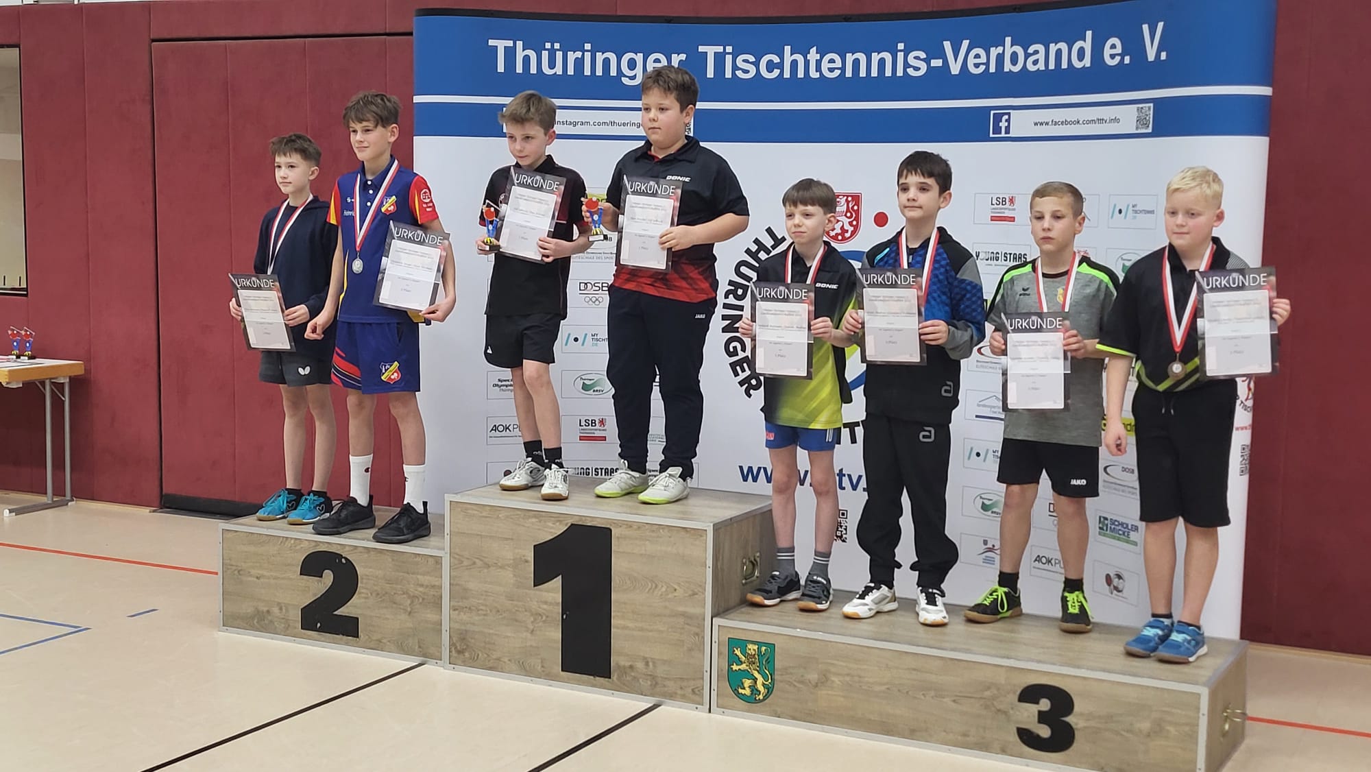 Deutlich erfolgreicher verlief das Turnier für Theo. Er qualifizierte sich souverän mit zwei klaren Gruppensiegen für die K.-o.-Runde und spielte sich dort mit konstant starken Leistungen bis ins Finale. Erst dort musste er sich seinem Doppelpartner Till Ulbrich (Post SV Mühlhausen) mit 0:3 geschlagen geben und erreichte somit den zweiten Platz im Einzel. Im Doppel harmonierten Theo und Till perfekt und dominierten ihre Gegner in allen Begegnungen mit 3:0-Siegen. Dafür wurden sie am Ende verdient Landesmeister im Doppel.