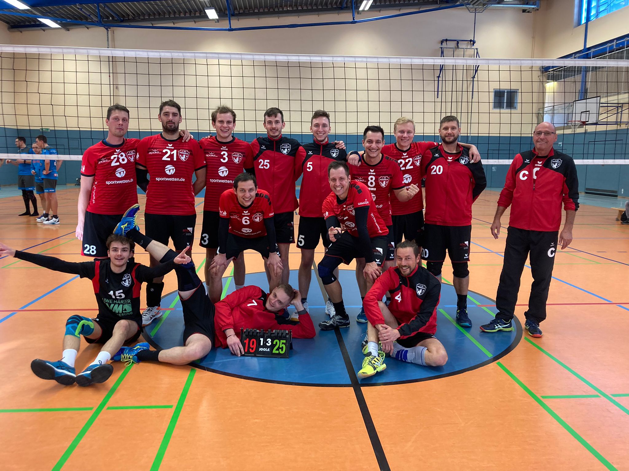 Kopf hoch, Brust raus, Bauch rein. Das sollte das Motto für die nächsten Sätze sein. 3 Punkte sind noch in greifbarer Nähe. So schwor Coach Kühn seinen unveränderten 6er auf den schlagbaren Gegner ein. Denkbar schlecht begann der erste Ballwechsel mit einem Fehlaufschlag des sonst so sicheren Kapitän. Erst beim 5:4 streckten die Pößnecker Schlafmützen den Kopf Richtung Morgensonne. Das Spiel plätscherte bis zur 18:15 Führung so vor sich hin, auch aufgrund der schlechten Aufschlagquote der „Fortunen“. Von den ersten acht Aufschläge wurden vier ins Netz oder Aus gesetzt ohne großen Druck. Scheinbar stand die Morgensonne immer noch zu tief. Das Glück der Orlataler war die schlechte Annahme der Landeshauptstädter. Im richtigen Moment wechselte der Coach auf der Service Position unseren Nick ein, der bis zum Satzgewinn bei 25:19 mit guten Aufschlägen den Gegner unter Druck setzte. So stand es nun 1:1 nach Sätzen.